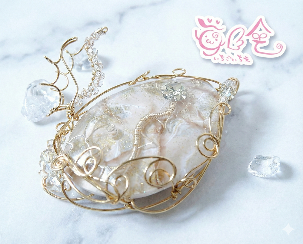 一から形を作り天然石風にアートをしたオルゴナイトを、ペンダントトップ用にワイヤーラッピングした物になります。