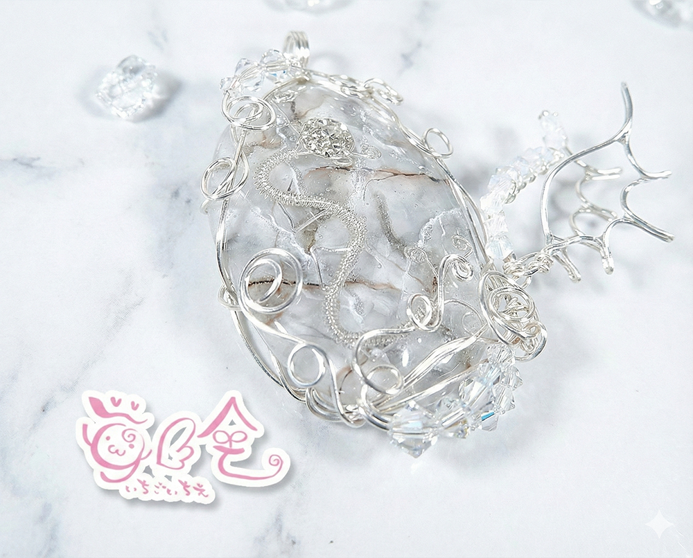 片面はワイヤーや天然石、星の砂など入りオルゴナイトとしてデザインし、片面は天然石風にアートした上にワイヤーで龍を形作りました。
